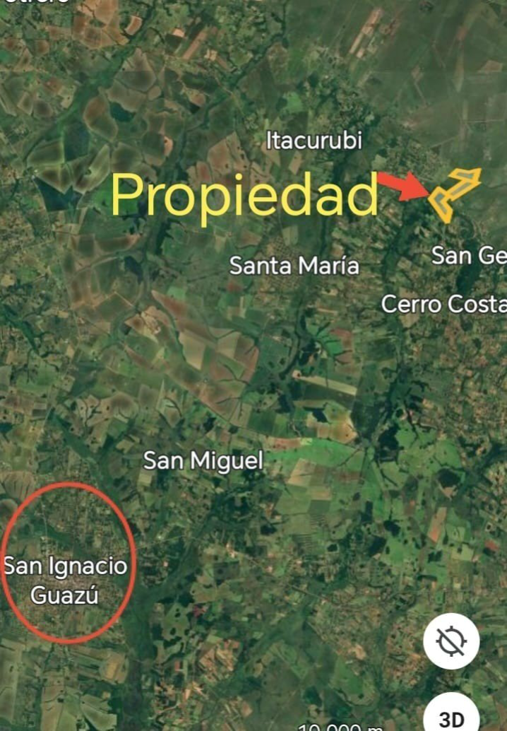 Property, 110 hectares, Santa María, Misiones, Paraguay, located between Cerro Costa and San Fernando, area suitable for agriculture and livestock, brick main house, cattle chute, corrals, good pasture, animal watering trough, stream, poultry coop, artesian well, pigsty, fully fenced, electricity, transformer, staff house, documentation up to date, ready to transfer.