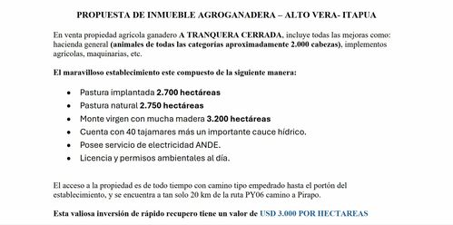 The property is accessible year-round via a paved access road and is located only 20 km from Route PY06 (the road to Pirapo).