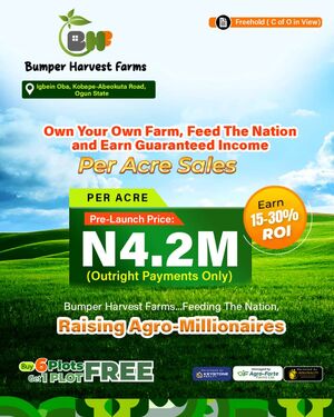 Bumper Harvest Farms gives eagle-eyed investors the unique opportunity to create wealth through agriculture by producing food either for home consumption or for commercial agricultural purposes thereby increasing the needed supply necessary to curb food prices inflation.