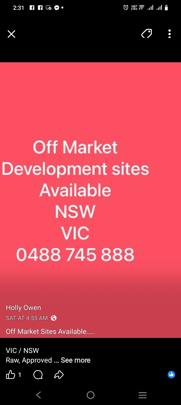 I'm Tol Just Narisma. I'm a real estate agent in Tagum City, Philippines. If someone is looking a farm lot, marble mining , homes and commercial building for sale in Australia. Kindly contact Madam Holly Owen. She is the holder of the farm lot, marble mining, homes and commercial building for sale in Australia. She is also the Director of the Lord's Real Estate International. This is her contact number,(048) 874 5888 or her email address,