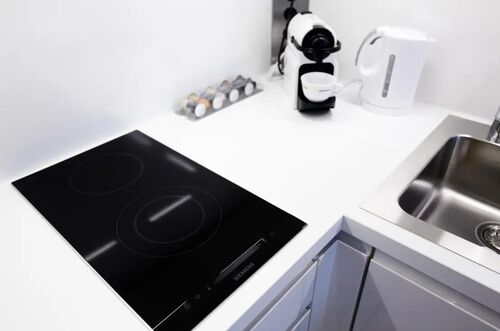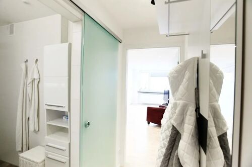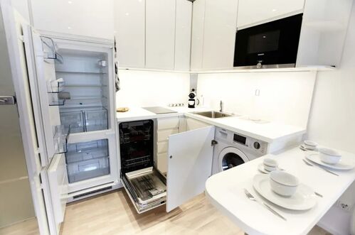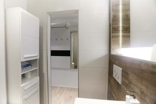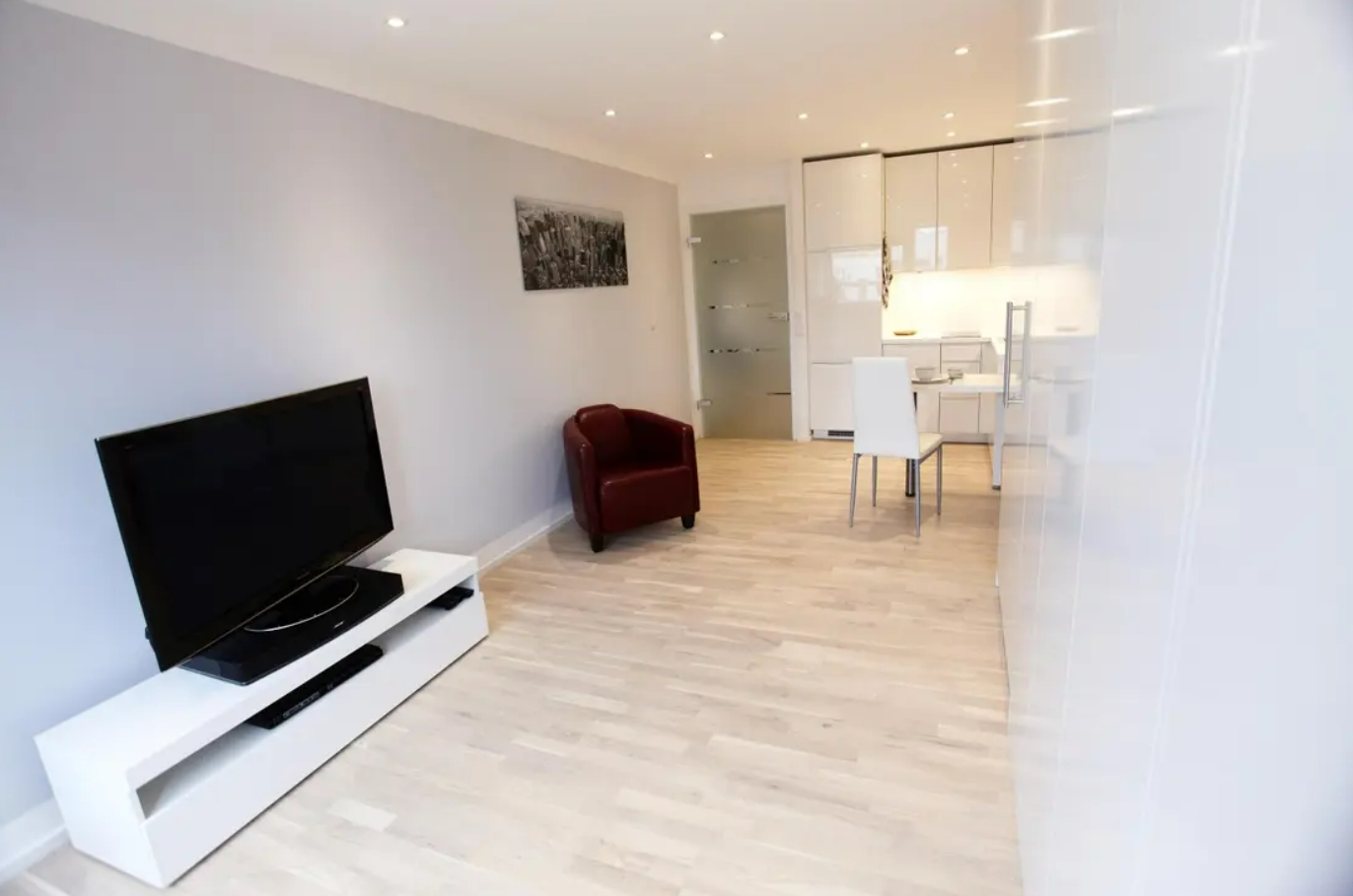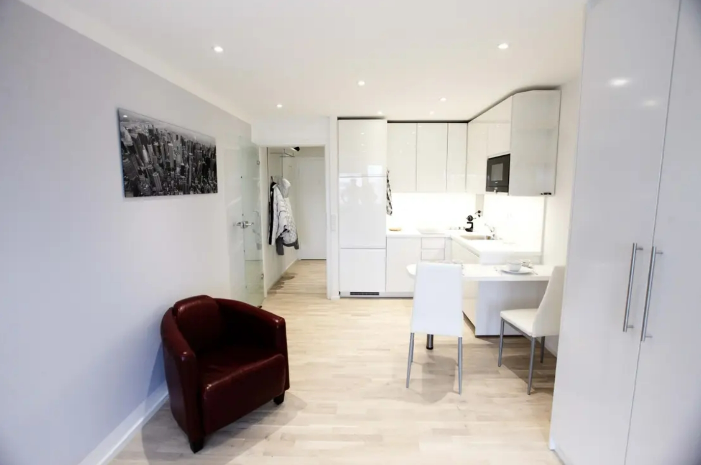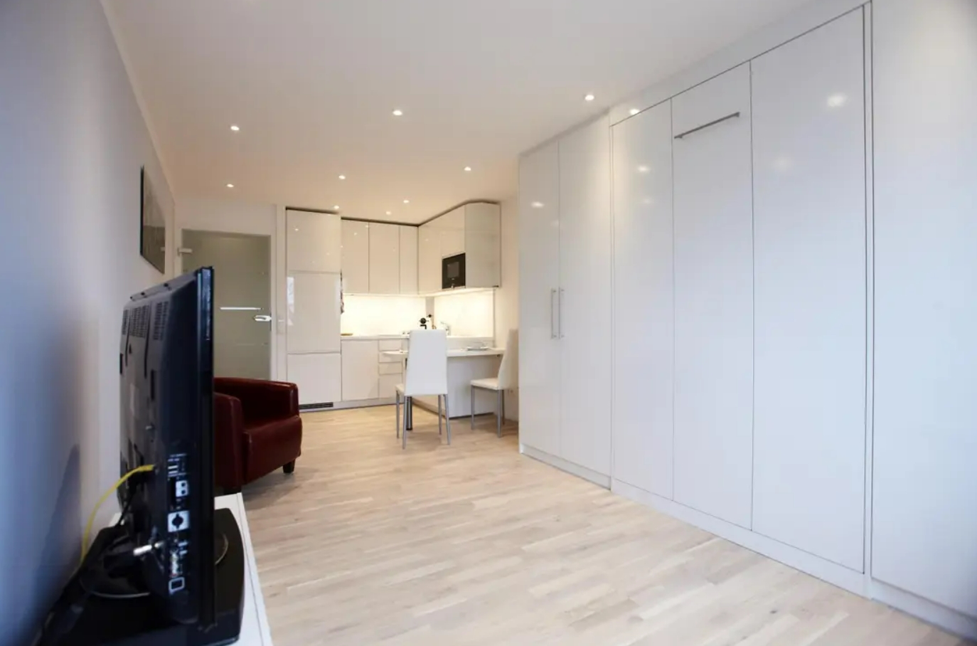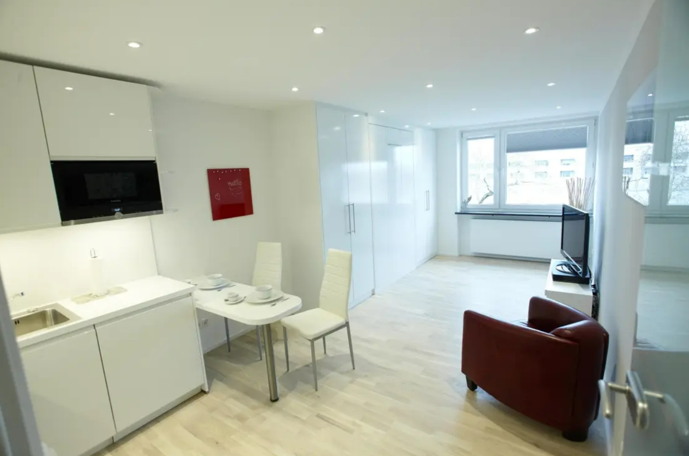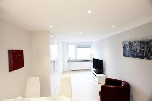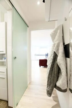 Die Wohnung ist komplett möbliert und sofort bezugsbereit. Der Wohnbereich ist mit hochwertigem Eichenparkett ausgestattet. Ein großer Einbauschrank bietet viel Stauraum und integriert ein komfortables Bett (120 x 200 cm) mit orthopädischer Matratze. Die moderne Einbauküche verfügt über hochwertige Siemens-Geräte, darunter Cerankochfeld, Geschirrspüler, Grill-Mikrowellen-Kombination, Kühlschrank mit separatem Gefrierfach sowie einen Waschtrockner in der Wohnung. Küchenutensilien und Geschirr sind ebenfalls vorhanden.