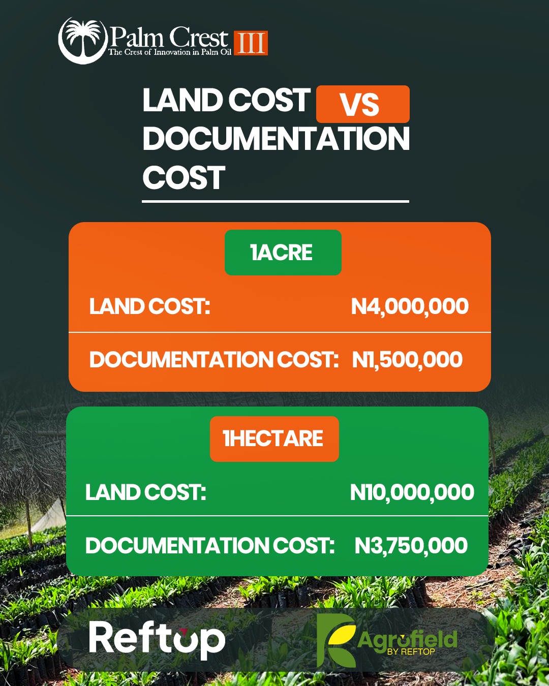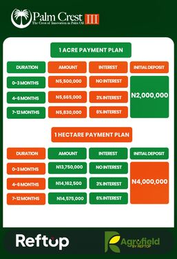 PALM CREST PHASE 3, ISEYIN OYO STATE A flagship agro-real estate project combining land ownership with structured palm plantation investment. At Palm Crest, investors own titled farmland while operations from planting to harvesting are professionally managed, creating a passive, long-term income stream tied to Nigeriaโs growing palm oil demand. Own a Piece of Nigeriaโs Thriving Palm oil Industry! THE STRUCTURED AGRICULTURAL ASSET Palm Crest Phase 3 represents the next evolution in structured agricultural ownership. It combines: - Titled farmland ownership - Professional plantation management - Integrated processing infrastructure - Commodity-linked returns - Long-term generational asset creation - Own the land, own the plantation & own the produce This is not; - Speculative farmland - Pooled crowdfunding - Fixed-return agricultural marketing