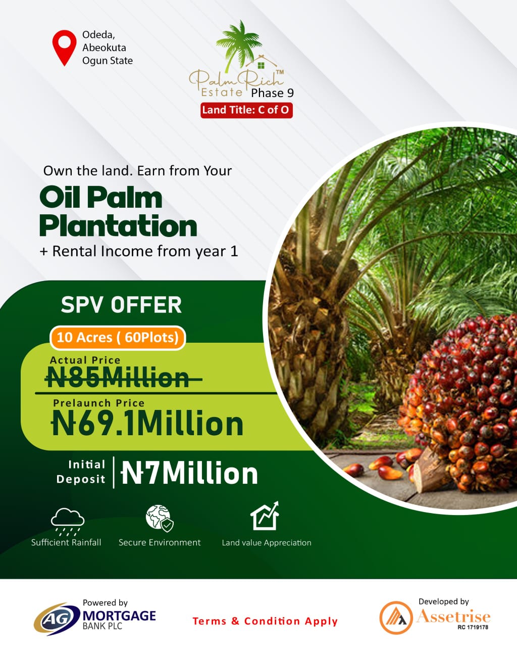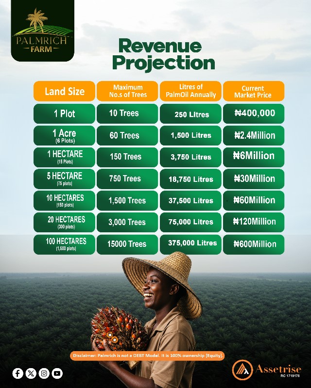 Own a piece of sustainable wealth in Odeda, Abeokuta, Ogun State! π΄ Palmrich Phase 9οΈβ£ offers you the chance to own a thriving Oil Palm Plantation, with potential returns of up to β¦160M+ in land value appreciation over 3 years plus significant yearly passive income up to 50 years