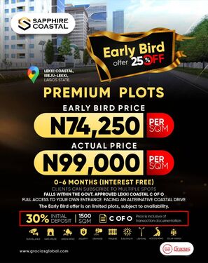 1500 SQM= N75,250 per Sqm.( Promo Price)= N112,875,000.