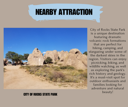 - Accessible Adventure: Conveniently located 15 minutes from Deming, NM, and right off I-10, so you can stock up on supplies and head back to nature with ease.