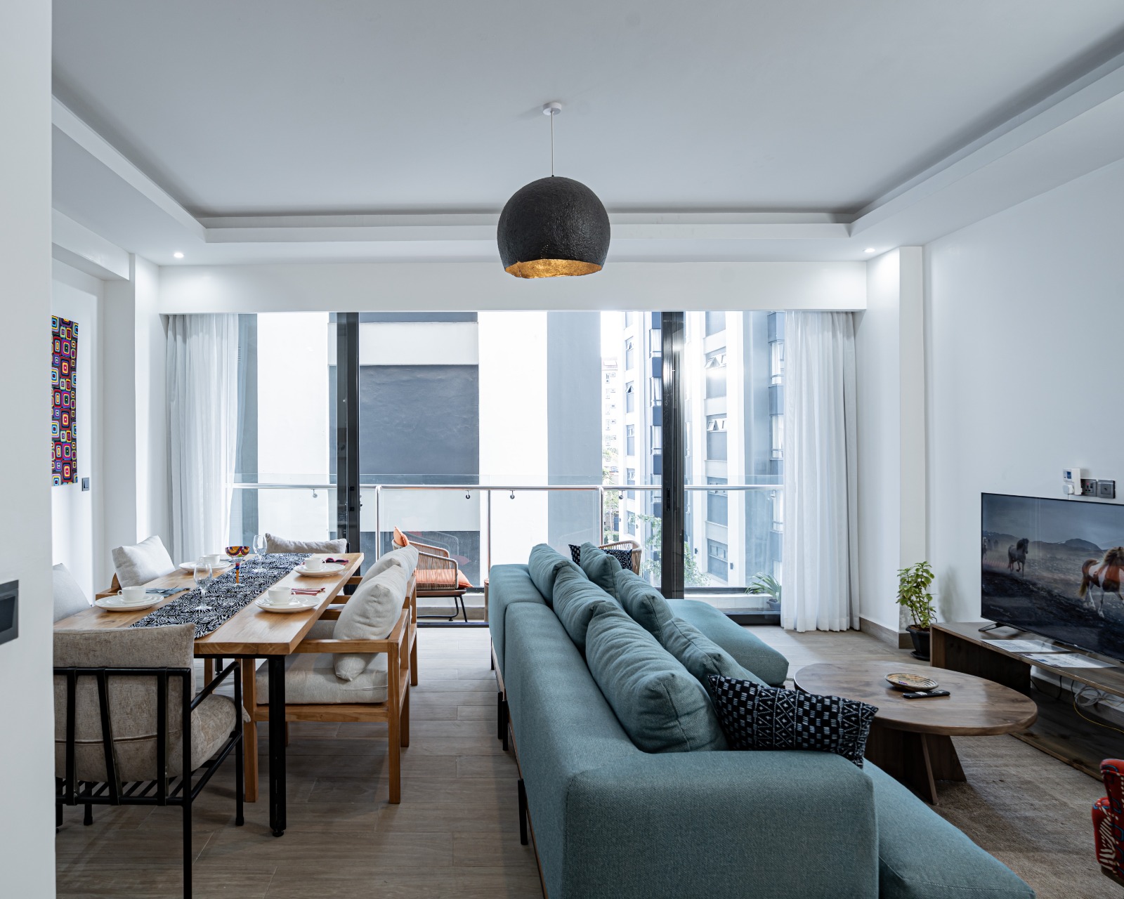 - Bright living and dining area with balcony views